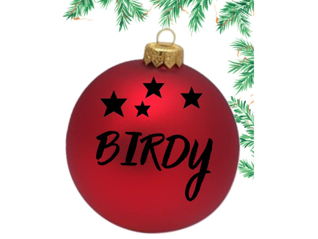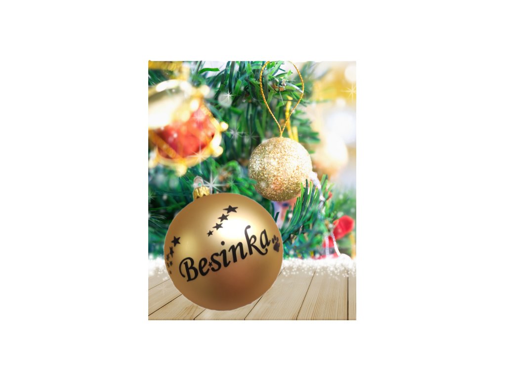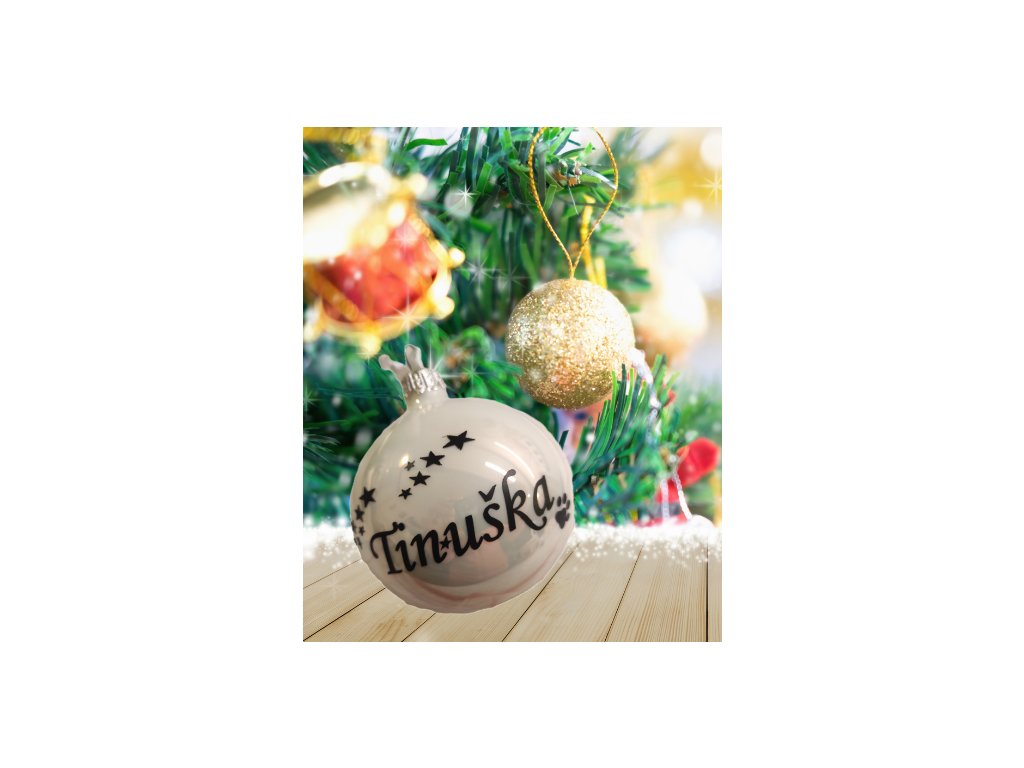 Bílá, zlatá nebo červená baňka nápisem a hvězdičkami. Foukané sklo, český výrobek. Velikost baňky je 6 cm. Lze si zvolit motiv jméno s hvězdičkami a tlapičkou a nebo motiv jméno s hvězdičkami a bez tlapičky.